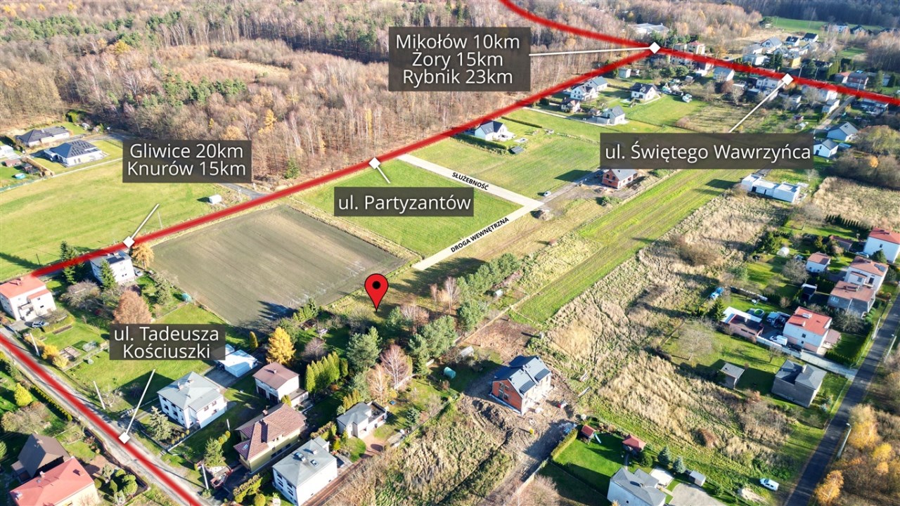 Dojazd do działek odbywa się od ulicy Partyzantów poprzez drogę wewnętrzną z ustanowioną służebność oraz drogę, w której każdy właściciel nabywa udział – udział ten jest wliczony w cenę nieruchomości.