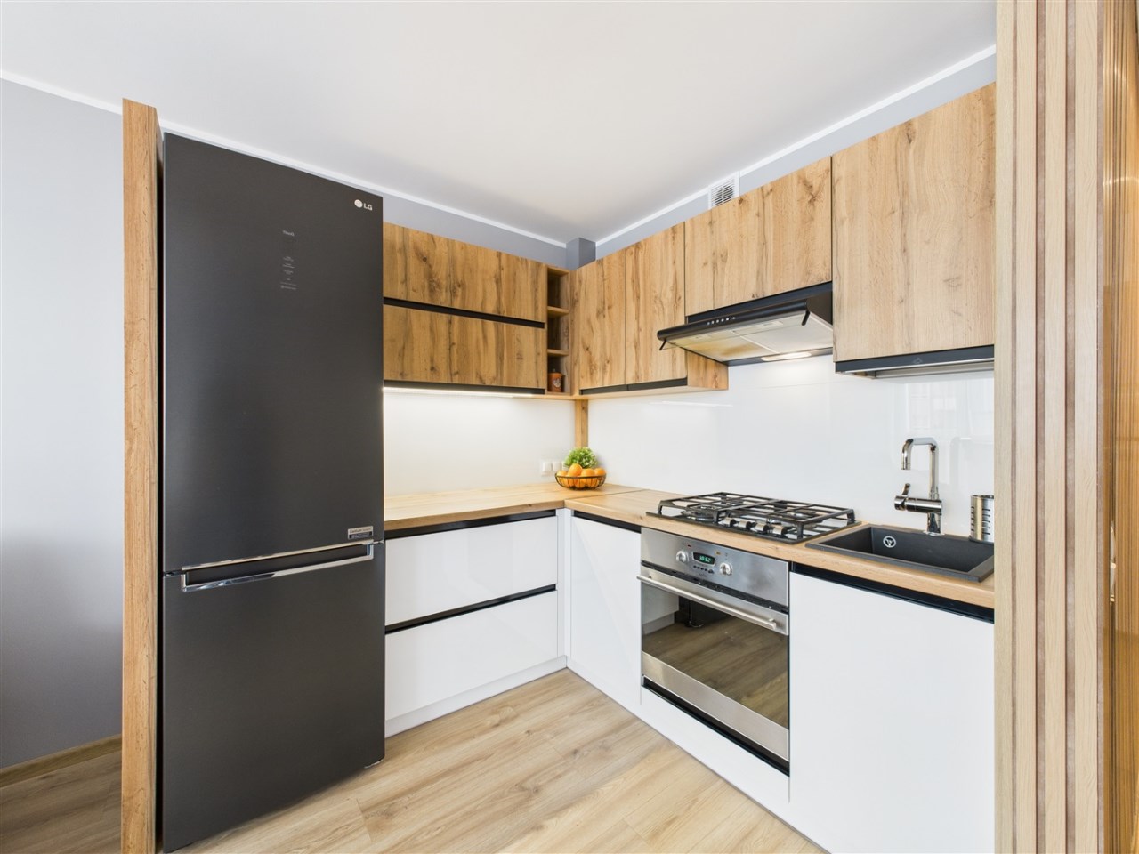 • W pełni wyposażony aneks kuchenny z praktycznymi meblami, lodówką, piekarnikiem i płytą gazową – miejsce, które sprawia, że gotowanie staje się przyjemnością.