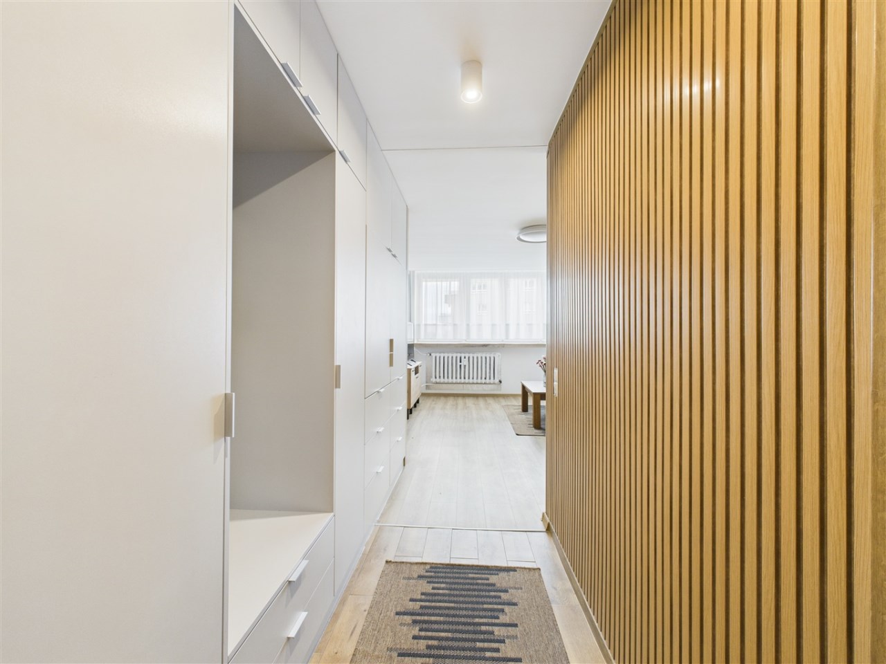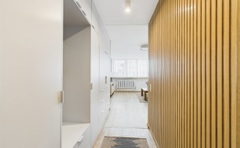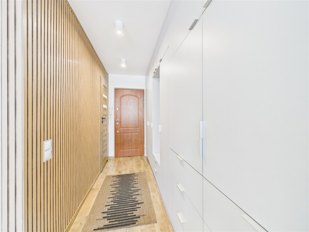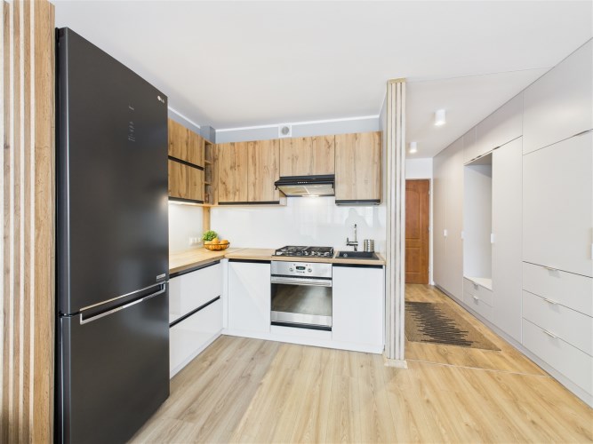 • Kuchnia i łazienka wyposażone są w praktyczne meble, a w przedpokoju znajduje się pojemna zabudowana szafa, która ułatwia przechowywanie i utrzymanie porządku.