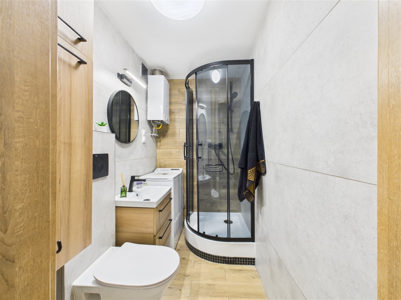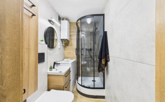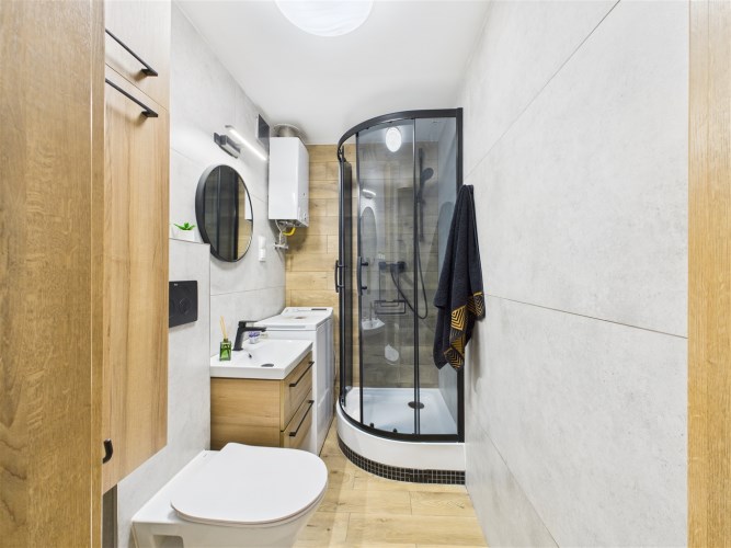 • Łazienka wyposażona w kabinę prysznicową, WC oraz pralkę - jej układ został przemyślany tak, aby była komfortowa w codziennym użytkowaniu.